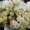 Ficta is a beautiful arrangement with white hydrangeas, white and green roses in a box.