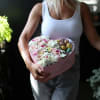 Freya is a mix of charming seasonal flowers are put together with 8 macaroons into a heart shaped box (pink /black /white). It's the best floral composition for any occasion. For any floral or color preference add a note to the order.