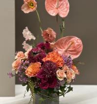 Bursting with color and texture, this lively arrangement blends the warmth of Orange and Pink Roses with Pink Peonies and Coral Ranunculus. Bright White Anemones and delicate White Scabiosa add a crisp contrast, while additional blooms, berries, and foliage create depth and movement. Perfectly balanced and full of energy, this bouquet radiates joy.