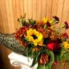 This cornucopia mixes up sunflowers, lilies, hypericum berries, red roses, fall daisys, orange waxflower and greens. Perfect addition to your holiday table!