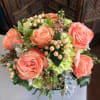 This Floral Design is highlighted by beautiful Peach roses set against a back ground of Hydrangea ans complimented with Hypercium AKA Coffee Bean. Created in a metallic urn.