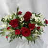 Elegant arrangement features vibrant red roses, charming white alstroemeria, and red carnations, beautifully accented with lush greenery. Perfect for expressing love, appreciation, or celebration. This bouquet comes in a heart decorated vase for added charm