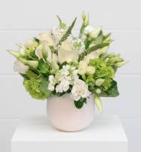 Cream, blush and soft pink roses accented with sage green eucalyptus in a white container