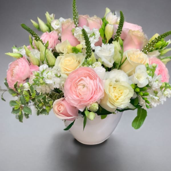 A lovely cottage garden bouquet with the finest, fresh flowers, beautifully arranged in a white ceramic pot. Perfect for Mother's Day and any other occasion. From order to delivery, Posies is truly the best ! Thank you !