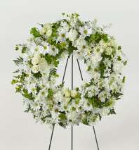 All white traditional sympathy arrangement included mums, snapdragons, stock, and carnations.