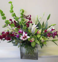 A brilliant mix of exotic tropical flowers provide the perfect backdrop for purple orchids.