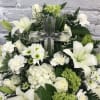 Stunning large crystal cross in nestled into the middle of white and light green flowers. This is a large, beautiful keepsake crystal cross. (This is a larger crystal cross than the ones featured in all the other "cross" bouquets) Bouquet measures approximately 18" tall and 22" wide. Very full and beautiful!!