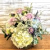 Make their day shine with this lush bouquet of hydrangea and roses accented with lisianthus, thistle dried lavender and eucalyptus arranged in a glass bowl.
