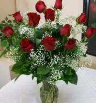 Demonstrate your affection and lasting love with this romantic design with red roses and red miniature carnations in a red glass vase, with added greenery accents.
