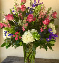 Classic, elegant and timeless - lush with hydrangea, roses, fragrant rose lilies, garden favorites like larkspur, Queen Anne's lace, stock and dianthus finished off with trailing ivy and seeded eucalyptus.