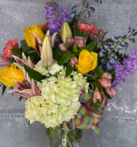 Mixed flowers and colors arranged in a clear vase