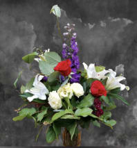 Multiple colors presenting nature's luxurious colors overflow in this beautiful, satisfying gardenny creation. You will have a combination of specifically chosen, assorted, seasonally available blooms in the order of a large asymmetrical triangle.