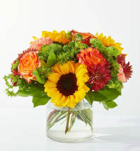 A vibrant collection of autumnal flowers makes this an excellent touch of seasonal beauty in any space.