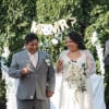 Atado a mano en un estilo suelto y fluido, el ramo exhibe hermosas rosas blancas, ranĂşnculos y hortensias, complementadas con toques de gipsofilia y follaje de eucalipto.