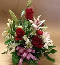 Let your love bloom with this beautiful arrangement of red roses and sunflowers.