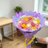 A mix of pastel colors roses wrapped in pink or purple wax special wrapping paper and bow