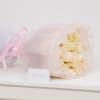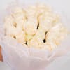 A round bouquet of two dozen roses. White mesh wrapping with a subtle shimmer, finished with delicate white lace trim with little pearl and a classic ribbon—romantic, elegant, and perfectly coquette.