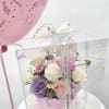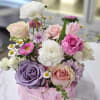 A cake-inspired floral design featuring roses and seasonal blooms in soft pink and lavender tones—sweet, elegant, and perfect for celebrations.