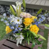 An arrangement of yellow roses, delphinium, white lilies, monte casino, greenery and filler in a mixed design that will remind of a drive around I-285 on a sunny day.