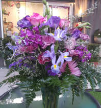A splendid display of blue and Lavender roses, blue and purple Delphinium, purple Mums, Ruscus and assorted greenery and filler. The Premium features blue Roses.