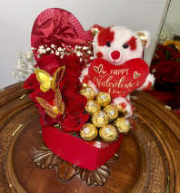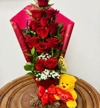 A stunning bouquet of 12 red roses wrapped in black and gold-trimmed paper, accented with baby’s breath and lush greenery. Nestled in a silver box and tied with a bold red satin ribbon, this arrangement speaks of passion, elegance, and timeless romance.