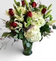 Red roses and white hydrangea are a perfect beautiful combination. Add more roses and hydrangea with our deluxe and premium sizes