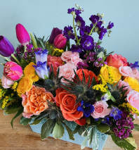 A mix of the freshest flowers that are in season, popping with bright colors. This is presented in a 360 all around arrangement.