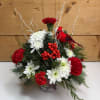 Our Birds of a Feather Bouquet is an ode to the beautiful cardinal, a classic symbol of winter and Christmastime. Featuring white pom-poms, red carnations, and wintery accents, this arrangement comes in a container with a design of a cardinal on it. It's all tied together with a cardinal pick on top to create a lovely design that makes the perfect gift all winter long.