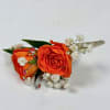 Two vivid orange rose blooms make this boutonniere a bright, celebratory accent for prom or any special-event lapel. The orange-and-white palette (roses with tiny white baby's breath) creates an energetic yet refined look that will make the person you're thinking of feel noticed and adored.