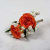 Two vivid orange rose blooms make this boutonniere a bright, celebratory accent for prom or any special-event lapel. The orange-and-white palette (roses with tiny white baby's breath) creates an energetic yet refined look that will make the person you're thinking of feel noticed and adored.