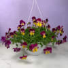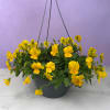 Planted densely for a full, cascading effect, the pansies spill over the rim with abundant green foliage at the center for a lush, rounded silhouette. Each white hanging pot comes ready on a white hanger or plastic hook with a plant tag included, making it easy to hang on porches, balconies, or indoors. Compact but generous in bloom coverage, these baskets provide immediate color and texture wherever they're displayed.