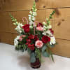Celebrate the season with the timeless charm of our Peppermint & Pine Bouquet. This festive arrangement blends crisp holiday reds and whites with fresh seasonal greenery for a look that feels both cozy and elegant. Designed with fragrant snapdragons, vibrant alstroemeria, classic roses, soft spray cushion mums, and textured carnations, each bloom is thoughtfully arranged to create depth and movement. Decorative candy canes add a playful peppermint twist, making this bouquet a perfect choice for holiday gifting, winter celebrations, or adding cheerful seasonal flair to any space.