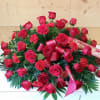 Red Roses & Carnation Half Casket Spray (SCF1162) Rich red roses and carnations are gorgeously arranged amongst lush greens and accented with a red satin ribbon S12-4465