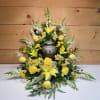 Yellow & White Urn Surround by Savilles Country Florist. Pay tribute to your loved one with a beautiful floral presentation to accent your loved one's urn or photo. This item is typically reserved for the closest family members, often the spouse, children, or siblings of the deceased. If you are not a member of the immediate family, we recommend that you select a more appropriate arrangement and do not order flowers for the Cremation Urn/Photo Tribute. We customize the flowers to suit the urn you selected as well as to represent the personality of your loved one who has passed away. This is a stunning presentation of seasonal yellow & white cut flowers presented in circular layout that provides a perfect backdrop for urns during a wake or funeral service. The flower types and shades will vary due to seasonal availability. The presentation will be similar to that shown in the photo with an approx size of 26" H x 26" W Please provide urn dimensions in delivery instruction area during online checkout, otherwise we will use the standard 11" W x 7" H x 7" D