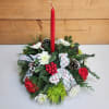 Make your holidays bright with our Yuletide Glow! This centerpiece features a single, red tapered candle, joined with carnations, mums, and festive decoration like bows, pinecones, and berries! This arrangement is the perfect display for your dinner table this holiday season, letting your gathering with your loved ones be accented with beautiful blooms and glowing candle light.