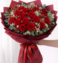 A luxurious arrangement of red rich roses, beautifully presented in a modern square concrete container and finished with a satin ribbon .