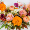 Bring the rich beauty of fall indoors with our Autumn Sunset arrangement. This seasonal design features a warm blend of orange marigolds, blush roses, peach ranunculus, burgundy scabiosa, and sunset snapdragons, paired with lush greenery and autumn berries.