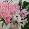 with pink tulips, white cymbidium orchids, pink hyacinth with the perfect amount of greenery to complete the look