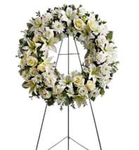 Beautiful flowers such as light pink roses and carnation, hydrangea and miniature carnations mix with lavender chrysanthemums on an open heart-shaped wreath.