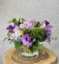 A lush, garden-style arrangement in deep burgundy, crimson, and lavender blooms--Moody and luxurious.