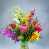 A unique and stunning arrangement filled with tropical flowers and lush greens.
