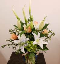 An artfully designed easel spray full of fresh, lush blooms in blues and white. Hydrangea, Bells of Ireland, Asiatic Lilies, Roses and a variety of fresh greens make up this eye catching tribute for a wonderful life once lived.