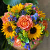 The Chelsea is a cheery design of sunflowers, roses, delphinium, thistle, hypericum & accent blooms arranged in a cubed vessel. A simply sun-filled arrangement sure to make anyone smile!