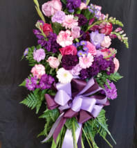 Available in nearly all colors, this wreath is a fitting tribute for your loved one. We can add ribbons or other items for military service, or hobbies or interests. Product is available in most flowers and colors. Medium is show, with Roses, and PomPom Mums, daisies, etc.