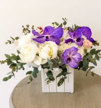 Surprise someone special with this wonderful display of pink orchids white peony and mixed fresh flowers. This truly fine pink flower arrangement is full of happiness and energy, with the power to brighten up anyone’s day when saying “thank you” or on a birthday.