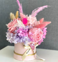 This delicate mini flower box features a soft blend of preserved light pink hydrangea, mini roses, and dried elements in complementary pink tones. Carefully arranged for lasting beauty, this elegant design brings a touch of serene charm to any space. Perfect for gifting or brightening up your own home, it’s a timeless piece that exudes grace and sweetness.