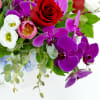 A beautiful arrangement of classical blossoms. Six traditional red roses have been modernized by combining with 3 gorgeous purple orchids and 10 stunning pink tulips. Eucalyptus is added to really elevate the look and a cute blue and white container allows these flowers to really shine.