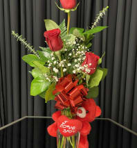 This arrangement has about 55-60 roses in a heart shape arch where a beautiful bear seats over the middle holding a box of chocolates. Also seats near sunflowers and ruscus greenery to complete the seat to this big arrangement.