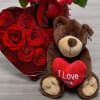 This charming Valentine’s arrangement showcases vibrant red roses with faux diamonds, nestled among delicate white accents and greenery, tied with a bold red ribbon. A heart-shaped balloon floats above, while a cuddly teddy bear and Chocolate heart box, add an extra touch of love and sweetness.