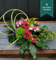 This custom-designed arrangement features rich, seasonal blooms with a vibrant autumnal palette. We use a thoughtful mix of sunflowers, lilies, gladiolus, and solidago—bringing together the golden hues, warm oranges, and soft rusts that perfectly capture the spirit of fall. The result is a floral tribute that tells a story of a life well-lived, rich in love, beauty, and memory.